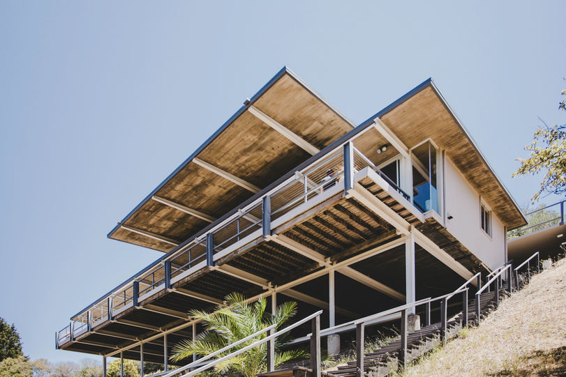 Beverley (David) Thorne (1924 - 2017) liked the challenge to design houses for hillsides, typically shunned by regular developers. His preferred medium was steel. It allowed him large spans, boldly cantilevered structures, while reducing earthwork and number of foundations to the absolute minimum.